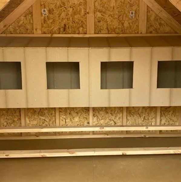 A standard Chicken Coop includes 4 ft walls, two 18”x24” windows, an adult sized door in the front, and a chicken sized door. Four nesting boxes and a roost are also included.
