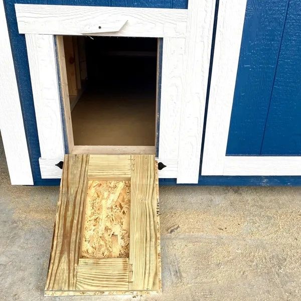 A chicken sized door built with treated lumber allows your chicken easy access to the inside of the coop while being tough enough to withstand the elements.
