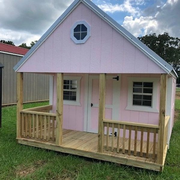 Sturdy wooden playhouses constructed from high-quality timber. Features include a pitched roof, windows, and a door, suitable for children's outdoor play.